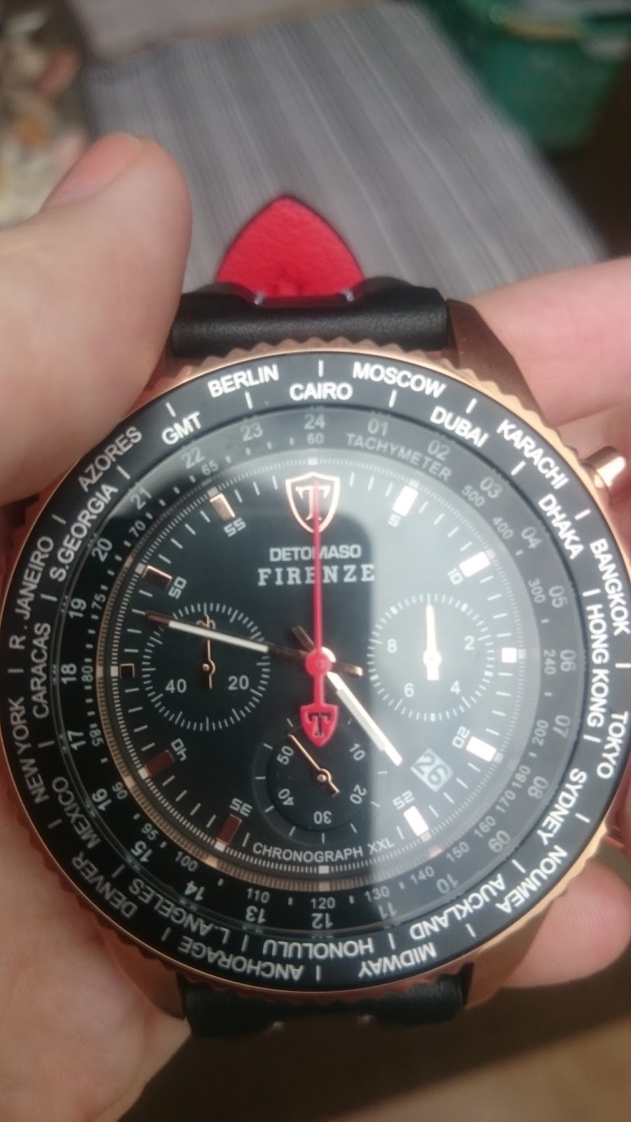 Das Armband der Uhr ist aus Leder und ist in den Farben Rot und Schwarz gehalten. Eine sehr schöne Kompination der Farben.